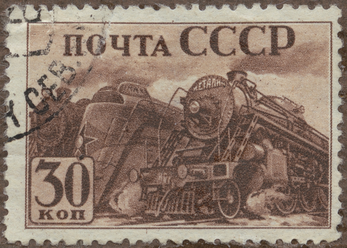 Frimärken ur Gösta Bodmans filatelistiska motivsamling, påbörjad 1950. Frimärke från Ryssland, 1941. Motiv av Nya ryska lok-typer "- Serie: rysk industri -"