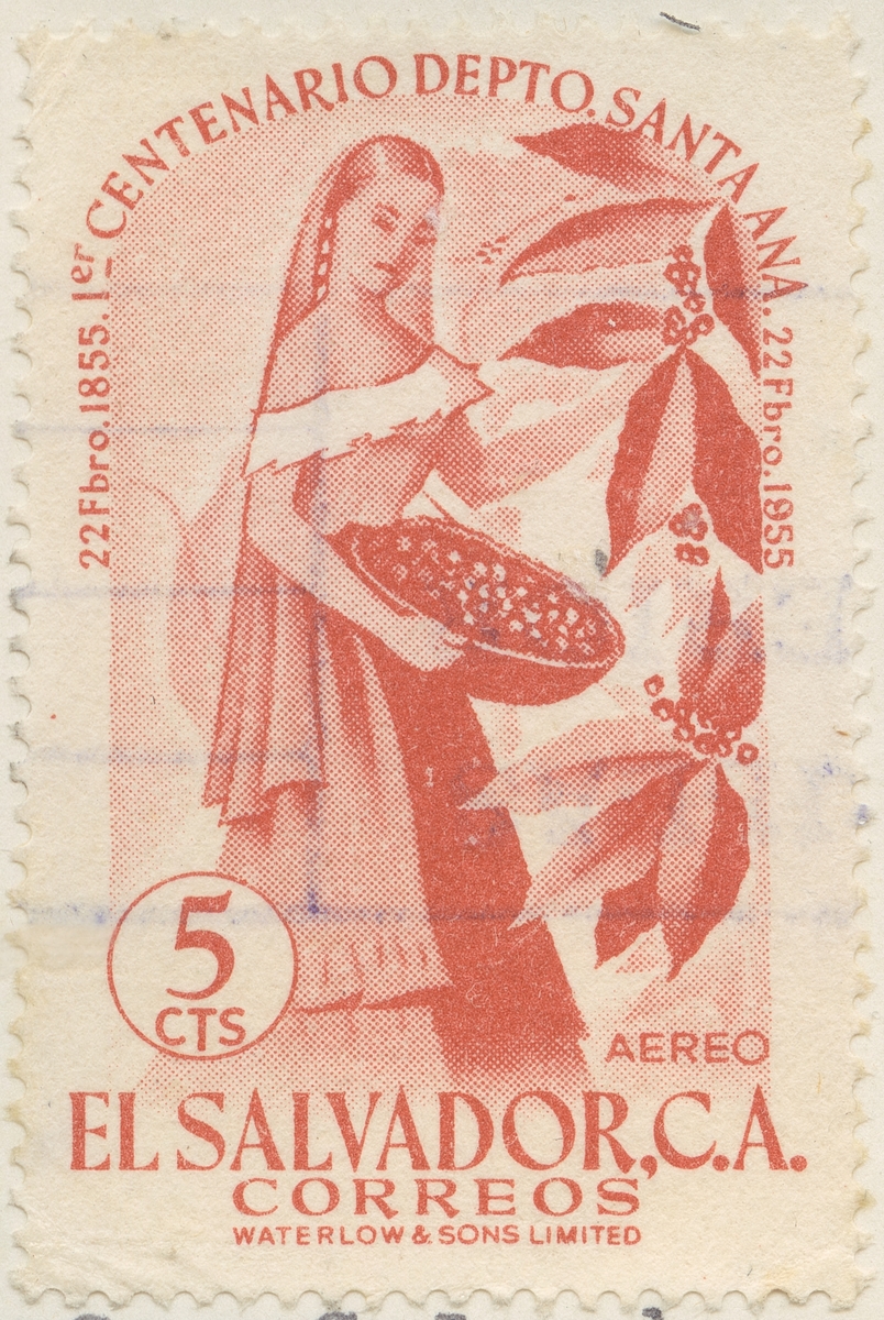 Frimärke från El Salvador, 1955. Motiv av kaffeskörd. "100-årsminne av grundläggningen av staden Ana, El Salvador, 1855-1955".