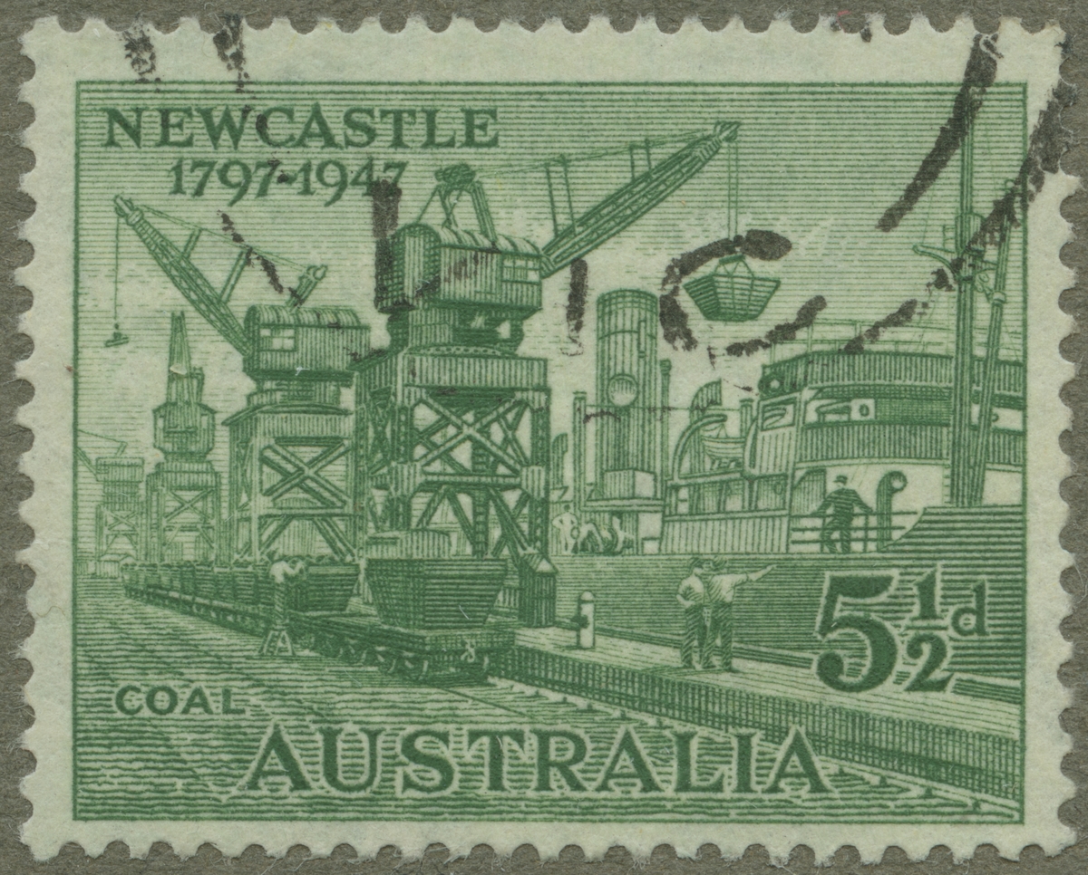 Frimärke från Australien, 1947. Motiv av Hamnkranar.