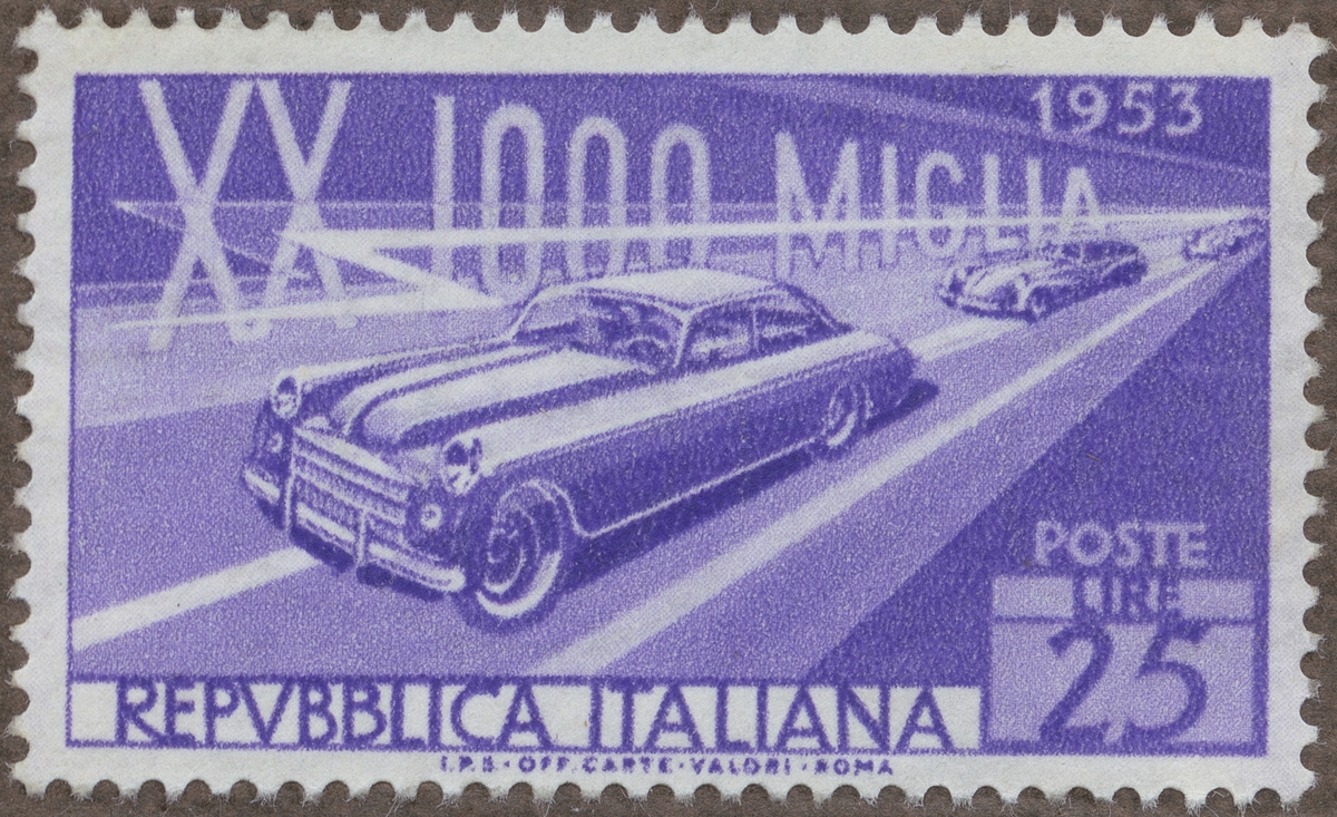 Frimärken ur Gösta Bodmans filatelistiska motivsamling, påbörjad 1950. Frimärke från Italien, 1953. Motiv av "Propaganda för 20:de biltävlingen på 1.000 italienska mil (= c:a 148 svenska mil)"