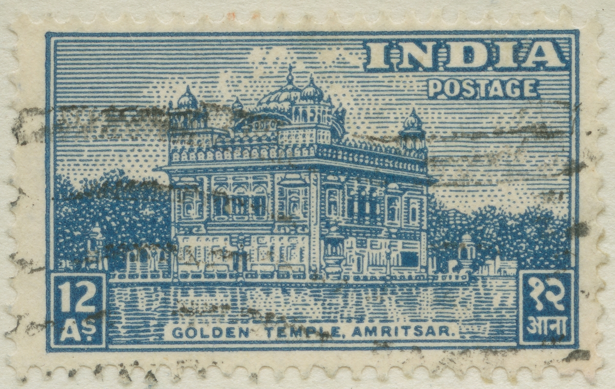 Frimärke från Indien, 1949. Motiv av Det Gyllene Templet i Amritsar.