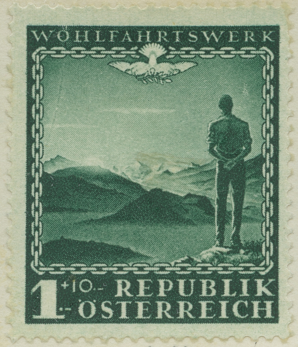 Frimärke ur Gösta Bodmans filatelistiska motivsamling, påbörjad 1950. Frimärke från Österrike, 1945. Motiv av Österrikiskt Berglandskap "Fredsduva Kedja"
