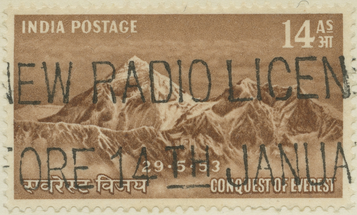 Frimärke ur Gösta Bodmans filatelistiska motivsamling, påbörjad 1950. Frimärke från Indien, 1953. Motiv av Mount Everest i Himalaya bergen "8.884 meter ö.h. Bestiget 29 maj 1953 av Sir Edmund Hillary från New Zealand tillsammans med sherpan Tensing. (sherpa= bergs guide)"