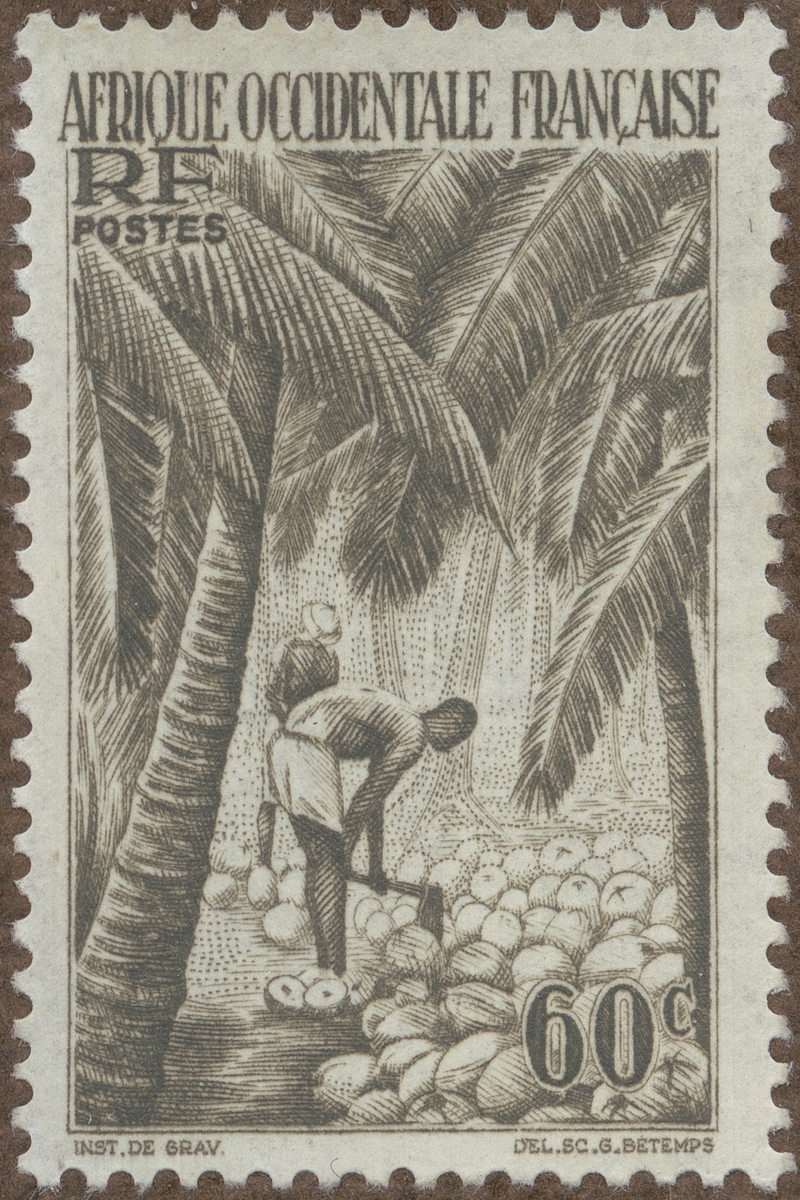 Frimärke från Franska Västafrika, 1947. Motiv av kokospalmer som skördas.