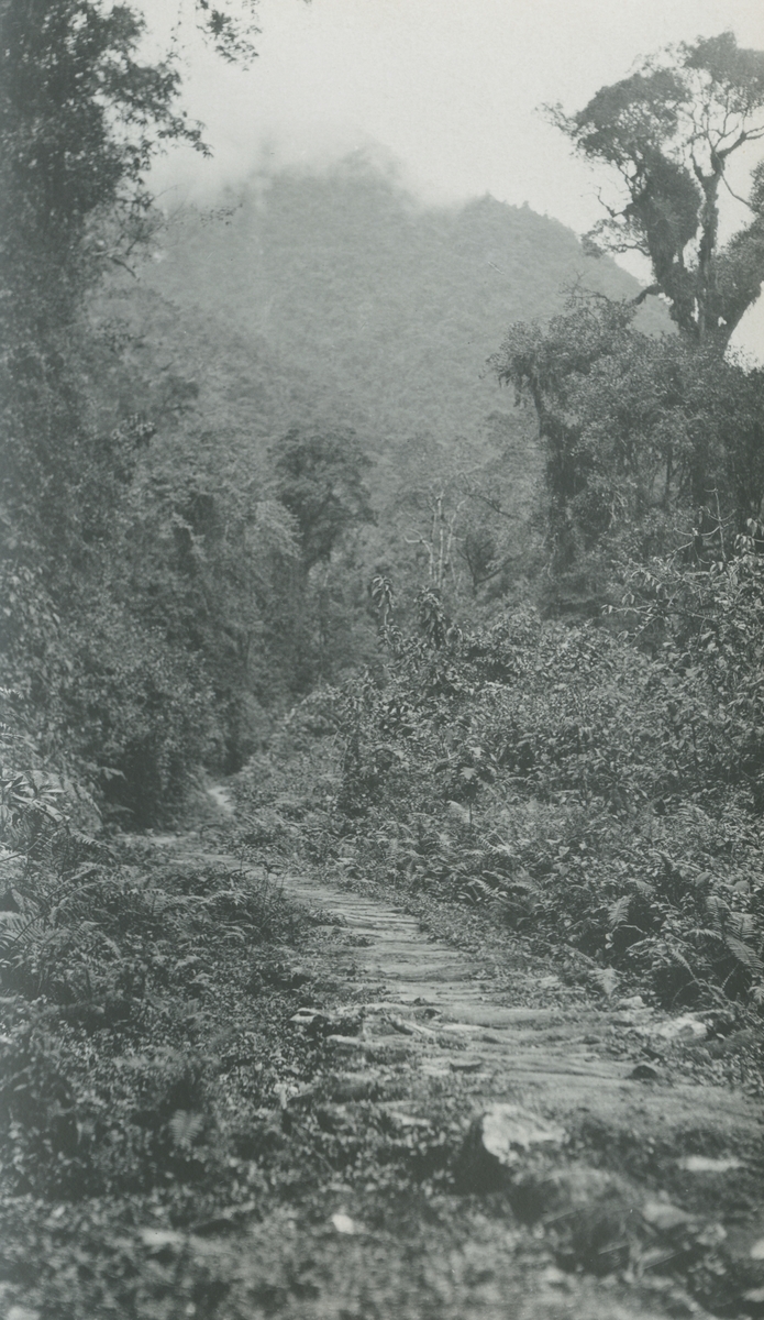 Fotografi från expedition till Peru 1920. Motiv av liten stig i djungeln.