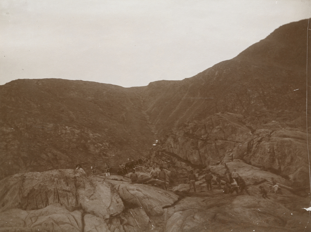Fotografi från expedition till Grönland. Bergslandskap med ett antal människor som poserar och barn som springer.