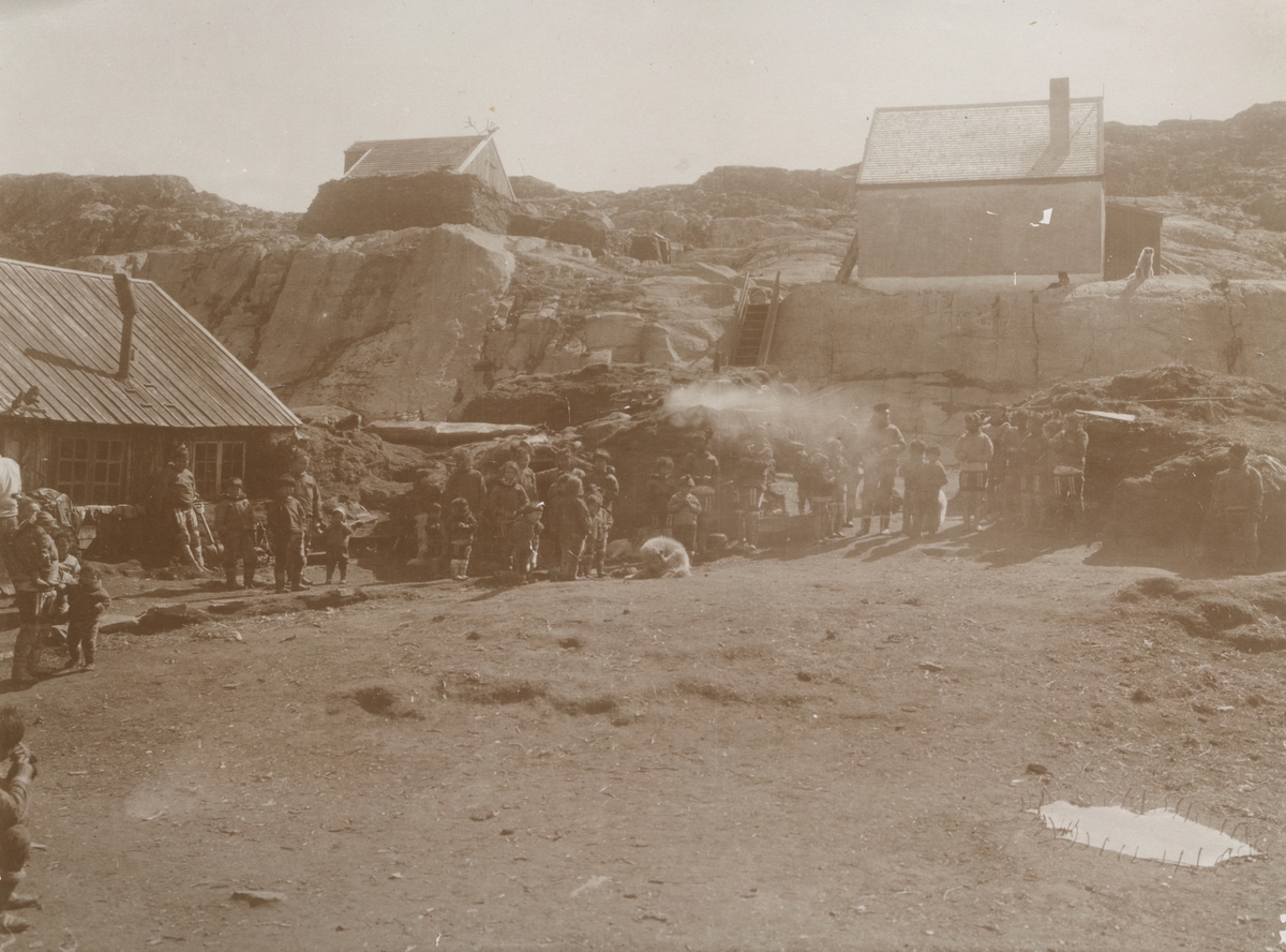 Fotografi från expedition till Grönland. Motiv av ett antal invånare i en by som står uppställda framför ett berg. På bilden syns tre hus och ett par hundar.