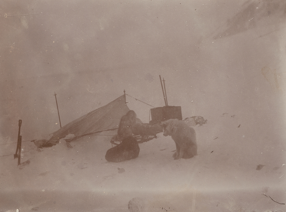 Fotografi från första svenska Antarktisexpeditionen 1901-1904. Motiv av hund och kälke utanför ett tält i ett snölandskap.