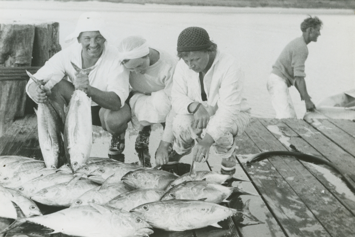 Fotografi från låda märkt Bernt Balchen. Balchen var norsk-amerikansk flygare, polarforskare och militär. Motiv av två kvinnor och en man på brygga med nyfångad fisk.