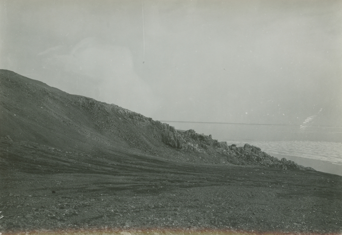 Fotografi från expedition till Östgrönland 1929. Dansk-svensk expedition under ledning av Lauge Koch. Svenska deltagare: Oscar Kulling och Helge Backlund. Vy över stenig strand, berg, hav och himmel.