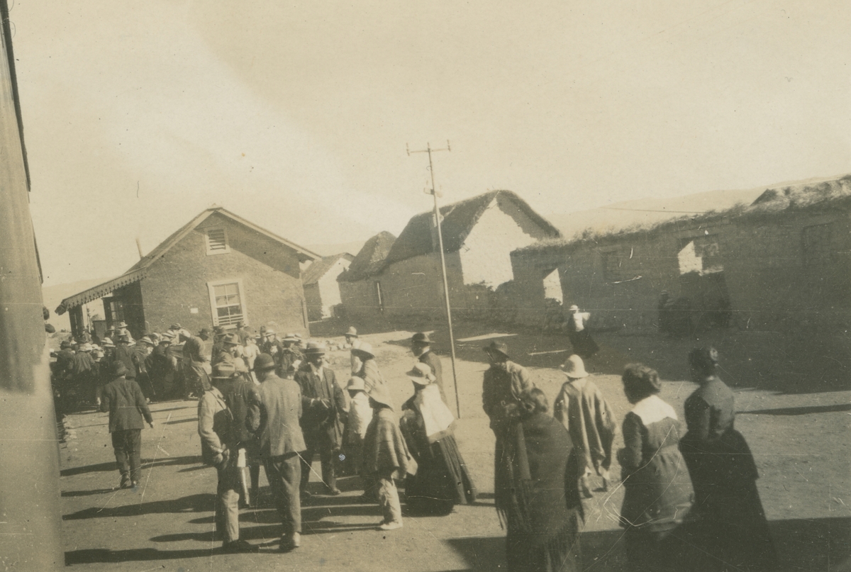 Fotografi från kuvert märkt med "Ernst Nordenskjöld". Motiv av en grupp människor som står på gata i liten stad/by. Troligen Sydamerika/Peru.