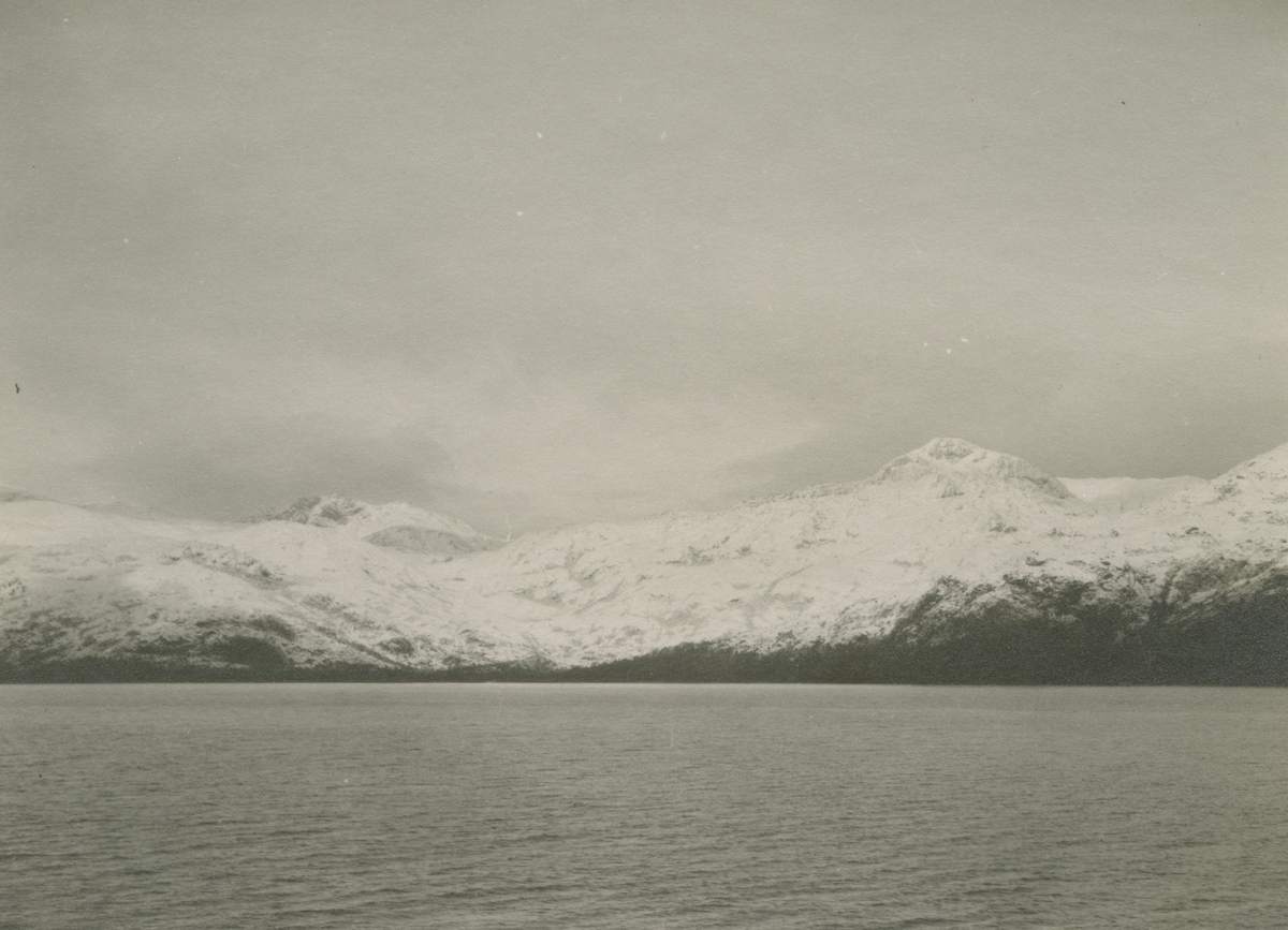 Fotografi från kuvert märkt med "Ernst Nordenskjöld". Motiv av hav, snötäckt berg och himmel.