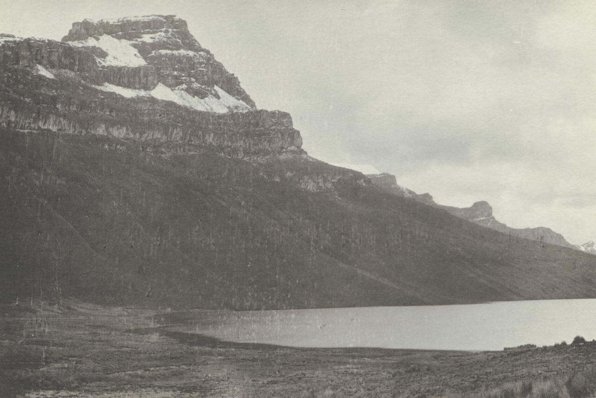 Fotografi från kuvert märkt med "Ernst Nordenskjöld". Vy över vatten och snötäckt berg.