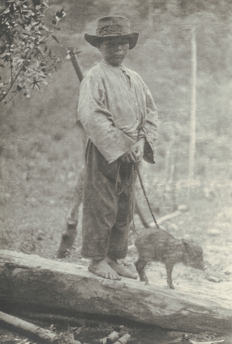 Fotografi från kuvert märkt med "Ernst Nordenskjöld". Motiv av pojke i djungel som har ett litet vildsvin i koppel.
