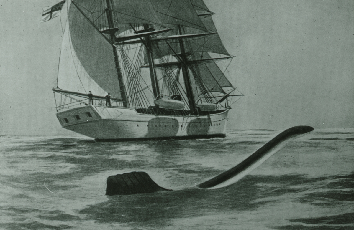 Fotografi från Spetsbergen. Teckning med motiv av båt på havet och vad som ser ut att vara ett sjöodjur.