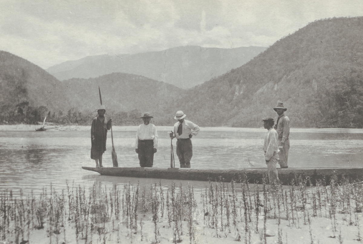 Fotografi från kuvert märkt med "Ernst Nordenskjöld". Motiv av expeditionsdeltagare vid kanot i flod i djungeln.