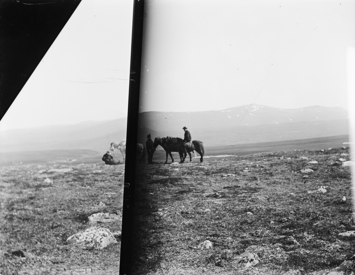 Fotografi från Grönland. Motiv av män med hästar i ett bergslandskap.