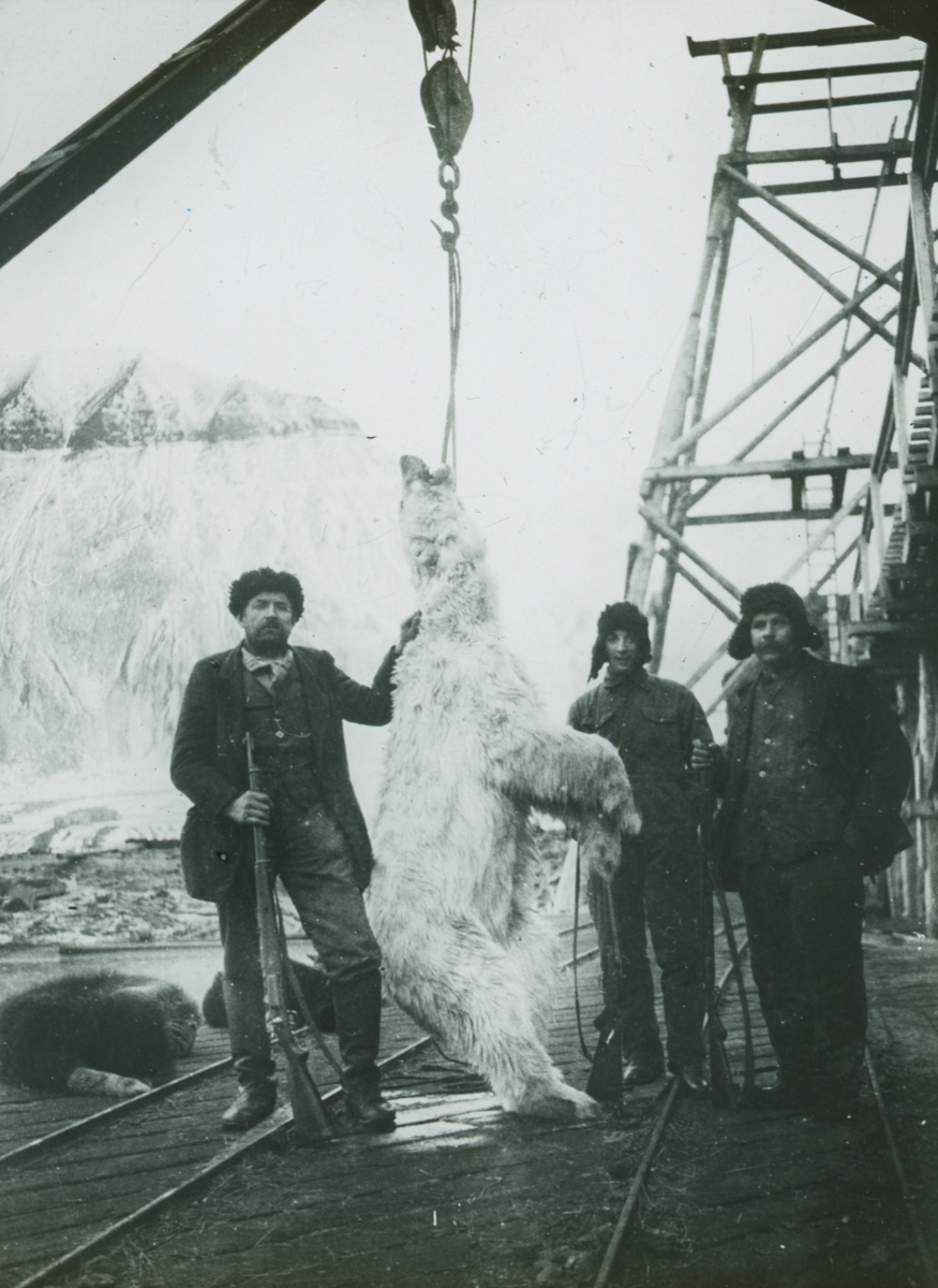 Fotografi från Spetsbergen. Motiv av tre män som poserar med skjuten isbjörn.
