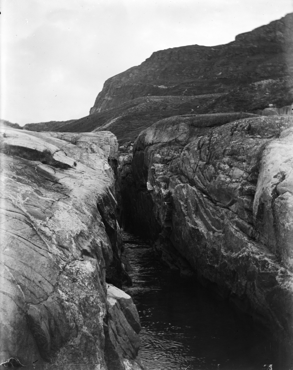 Fotografi från Grönland. Motiv av vatten som rinner genom berg.