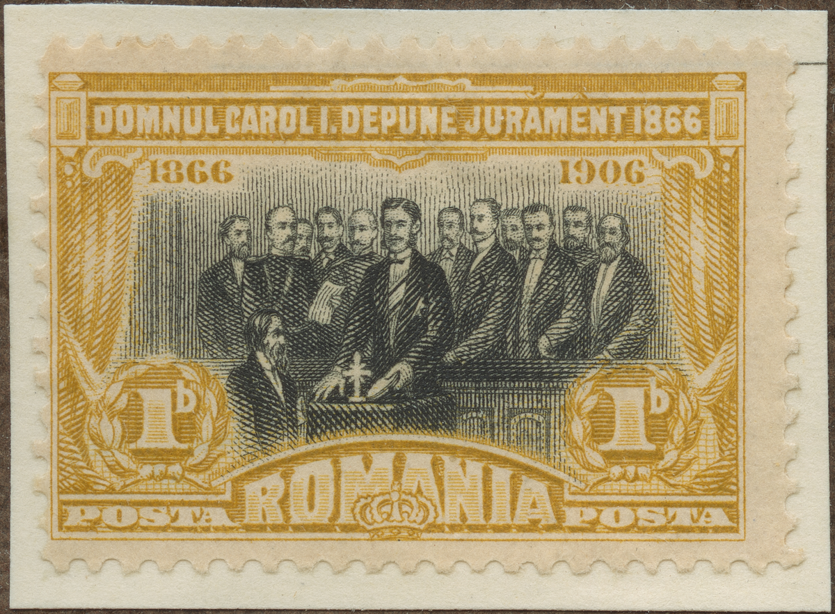 Frimärke från Rumänien, 1906. Motiv av prins Karl av Rumänien avlägger författningseden. Furste 1866-1881 Kung 1881- "40-års regering 1866-1906."