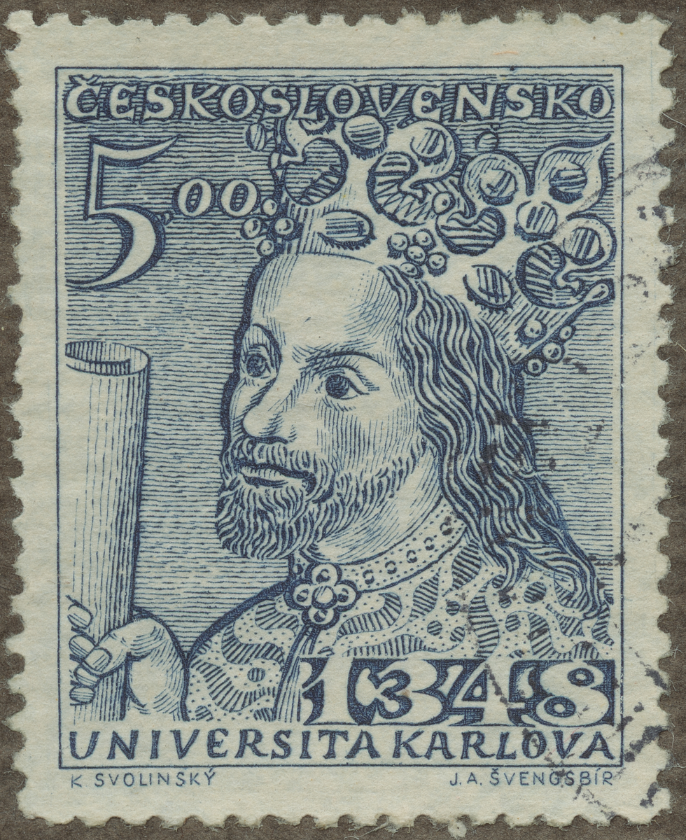 Frimärke från Tscheckoslovkiet, 1948. Motiv av Karl IV 1316-1378 Tysk-romersk kejsare Grundade universitetet i Prag Universitetets 600-årsminne: 1348-1948.