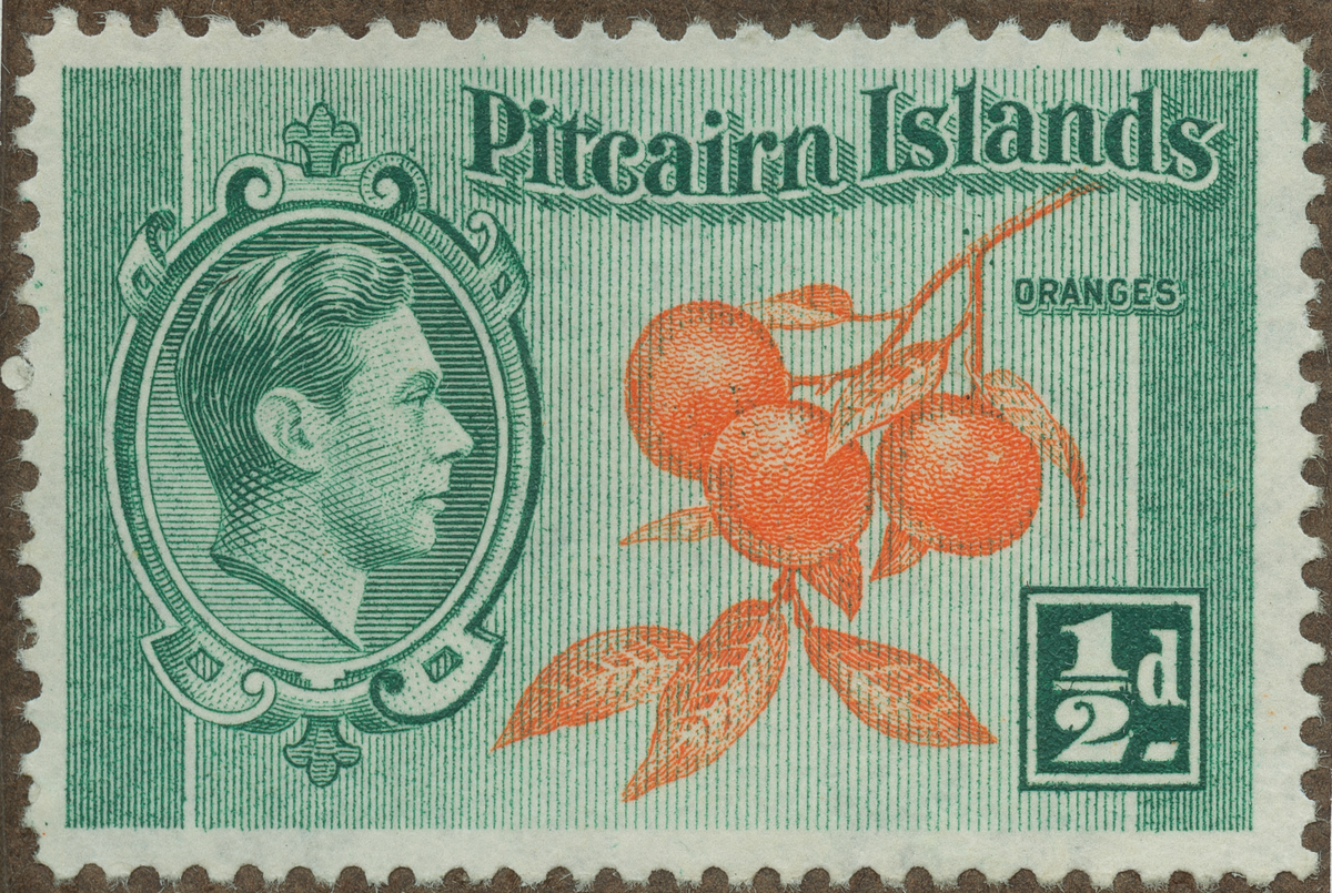 Frimärke från Pitcairn Öarna, 1940. Motiv av Kung George VI av England. Kvist med apelsiner.