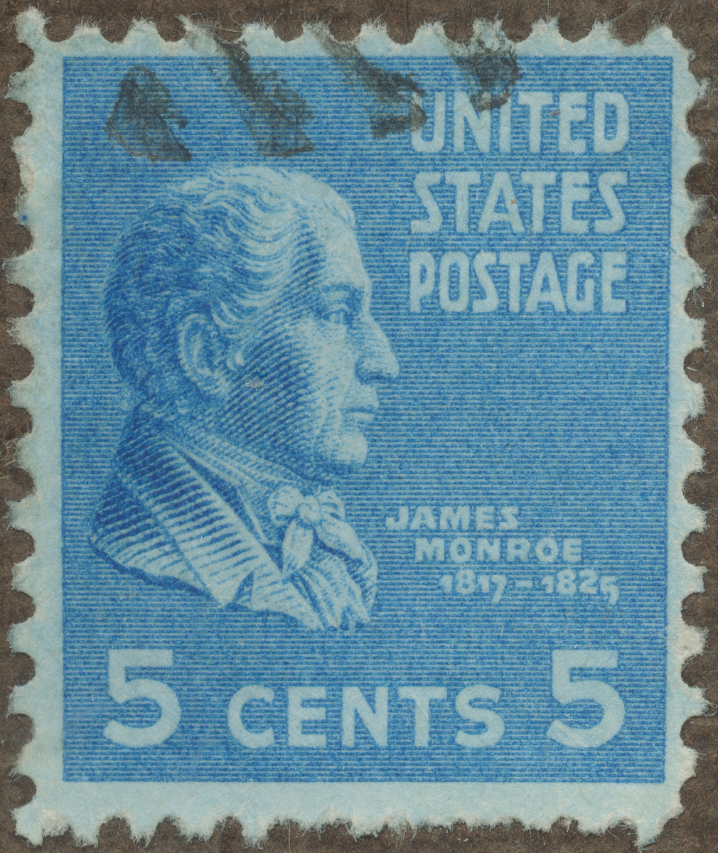 Frimärke från U.S.A., 1938. Motiv av James Monroe: 1758-1831 USA:s 5-te president: 1817-25. Avslutade inköpet av Louisiana distriktet 1803. "Monroe-Doktrinen" 1823.