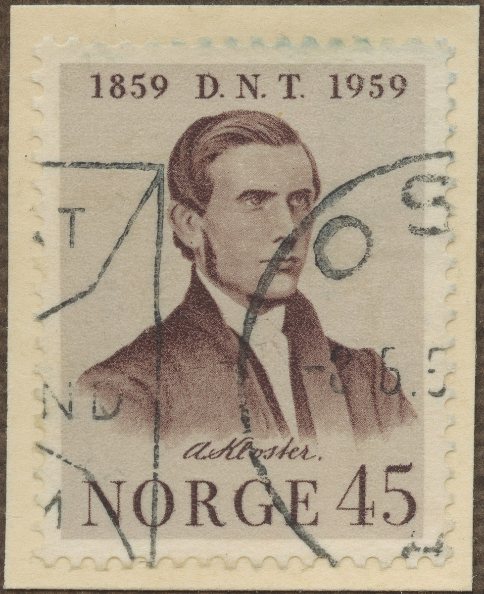 Frimärke från Norge, 1959. Motiv av Asbjörn Kloster: Stiftare av "D.N.T"= Det Norske Totalavholdsselskap. 100-årsminne av selskapets grundläggning: 1859-1959.