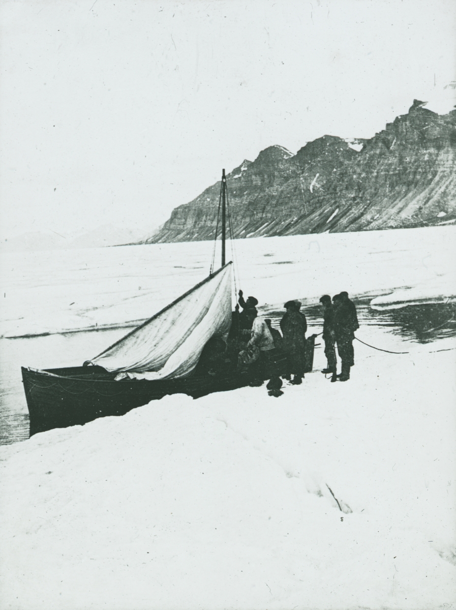 Fotografi från expedition till Spetsbergen. Motiv av män på isflak och båt i vattnet.