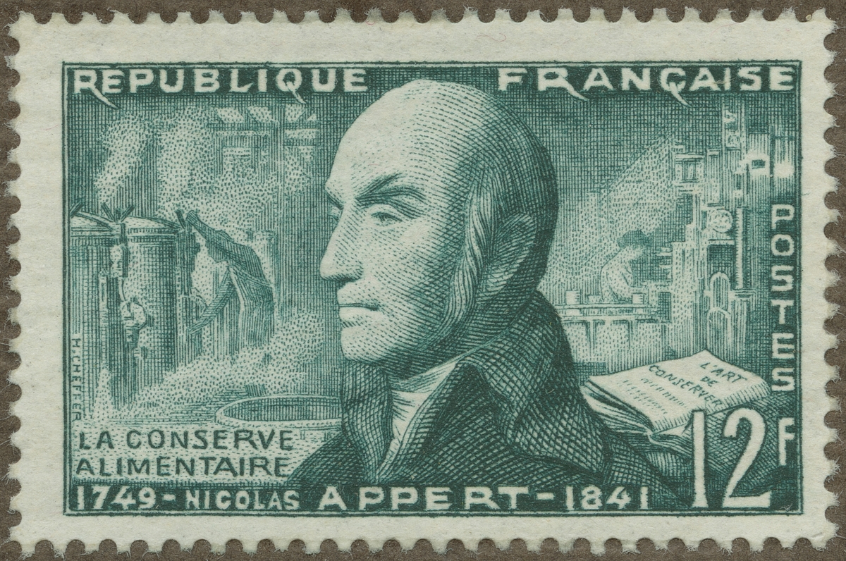Frimärke från Frankrike, 1955. Motiv av Benjamin Nicolas Marie Appert: 1749-1841. Matkonservering i lufttätt, slutna dosor-"Hermetik". Filantrop. "Serie: franska uppfinnare"