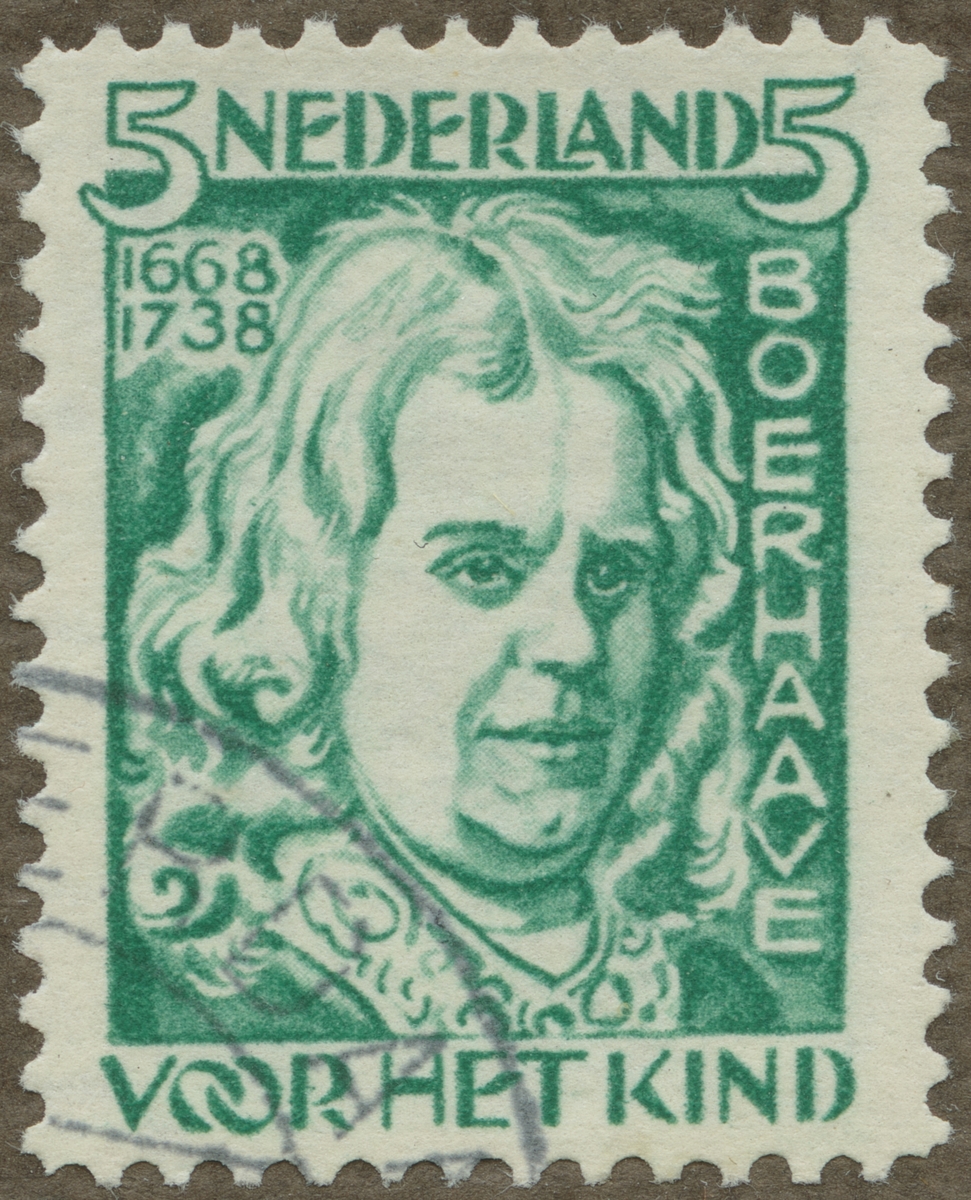 Frimärke från Nederländerna, 1928. Motiv av Hermann Boerhaave: 1668-1738. Framstående holländsk naturvetenskapsman och läkare. C.v. Linnés lärare.