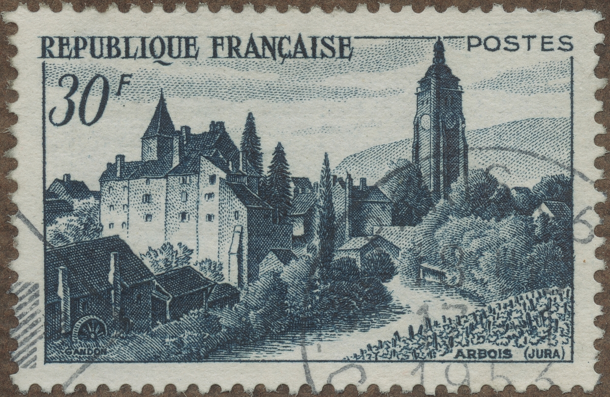 Frimärke från Frankrike, 1951. Motiv av Slottet och Domen i Arbois, Jura