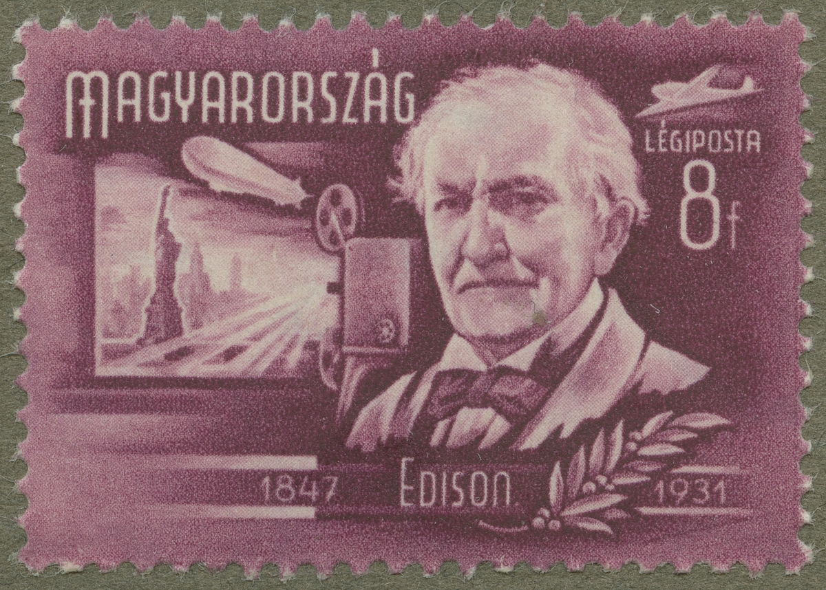 Frimärke från Ungern, 1948. Motiv av Thomas Alva Edison: 1847-1931. Amerikansk ingenjör. Duplextelegrafering 1877 mikrofonen, fonografen, 1879 koltrådslampan, 1882 New Yorks första station för elektrisk belysning, 1891 kinetoskopet: rörliga bilder. -I bakgrunden: filmprojektion.