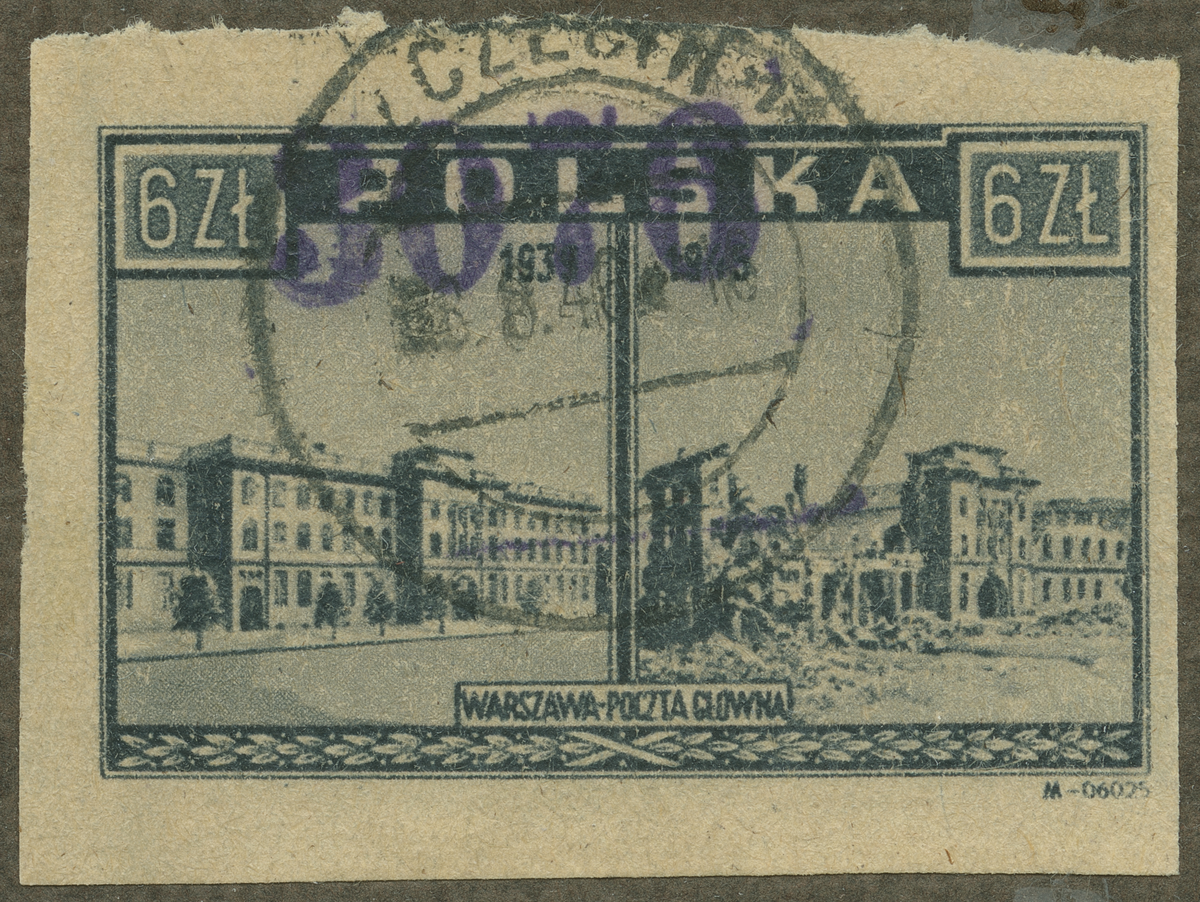 Frimärke från Polen, 1945. Motiv av Huvudpostkontoret i Warschau Före och efter bombning