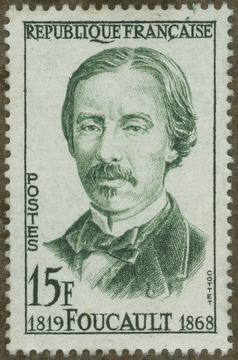 Frimärke från Frankrike, 1957. Motiv av Jean Bernard Léon Foucault: 1819-1868. Pendeln: Jordrotationen. Ljusets hastighet
