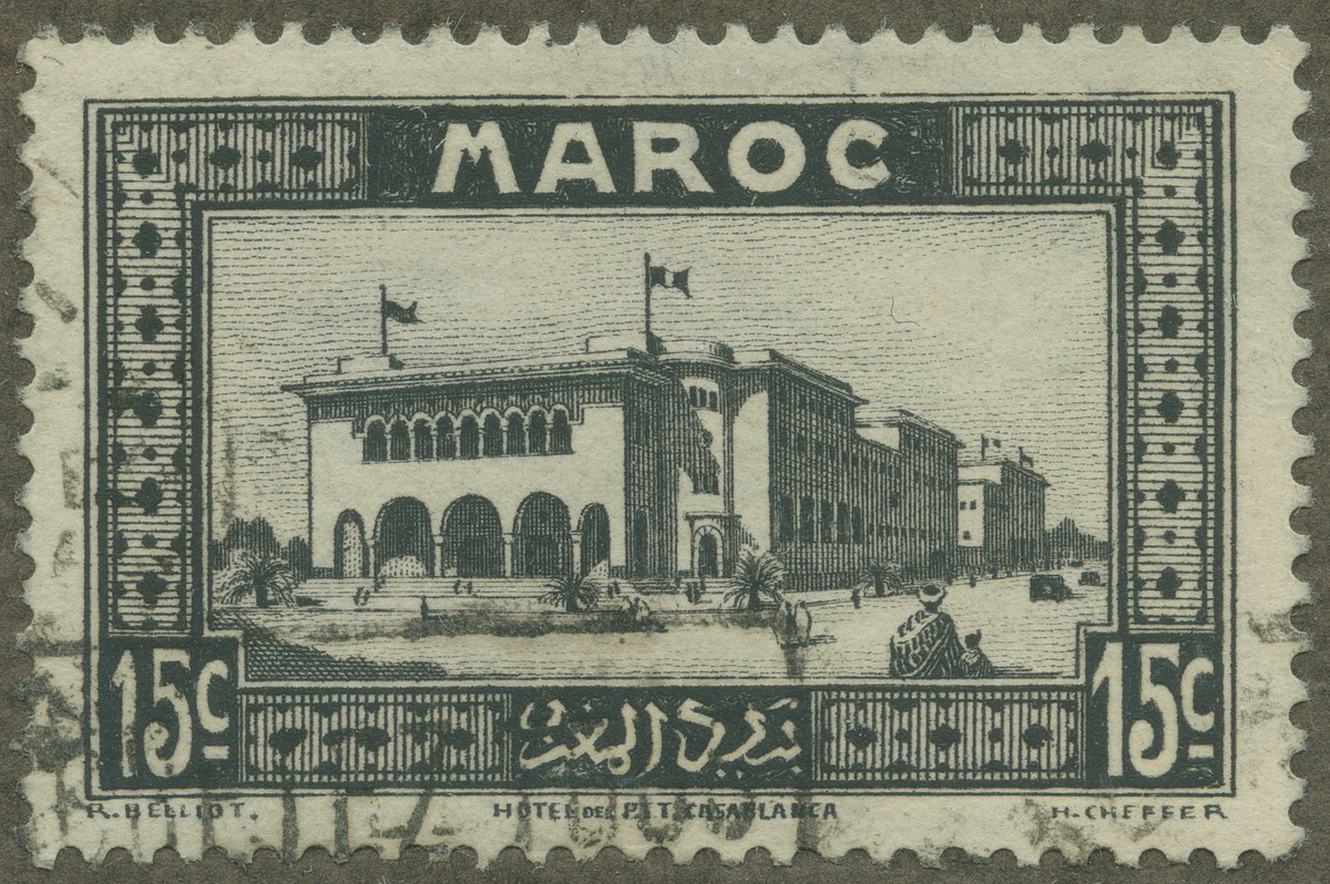 Frimärke från Franska Marocko, 1933-34. Motiv av Posthuset i Casablanca