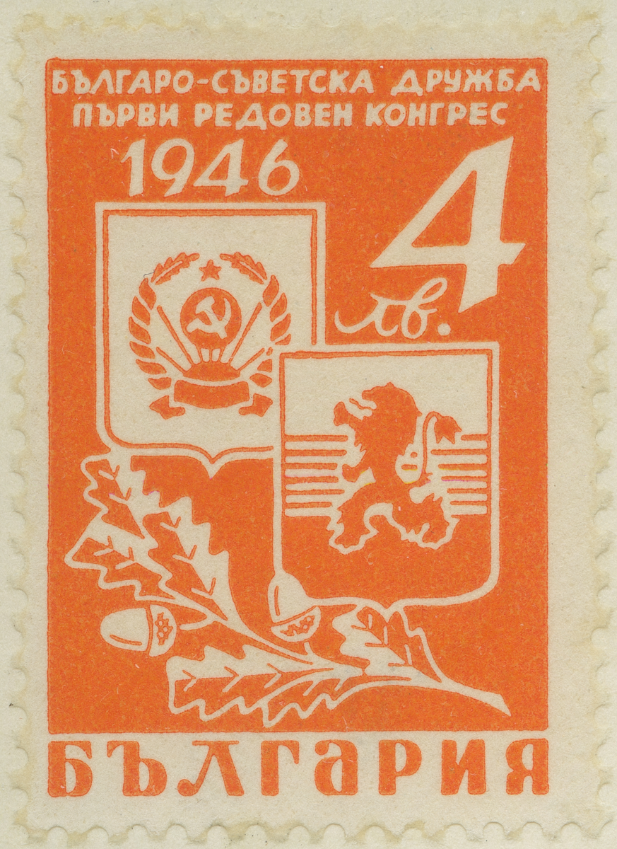 Frimärke från Bulgarien, 1936. Motiv av Rysslands vapen: och Bulgariens Vapen (Lejon) -Minne av bulgariska Sovjet-föreningars Kongress i Maj 1946-