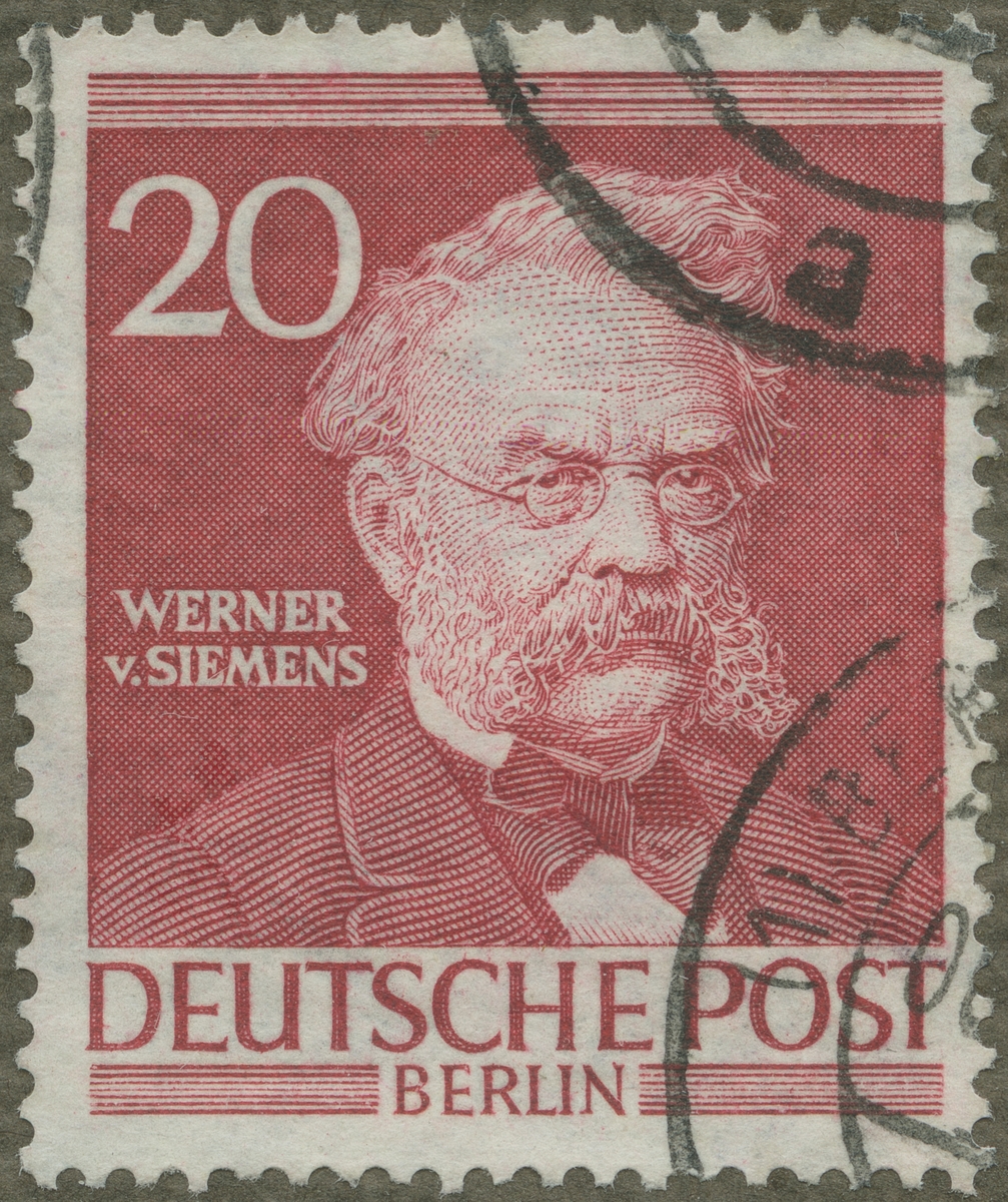 Frimärke från Tyskland, 1952. Motiv av Ernst Werner von Siemens: 1819-1892. Grundade 1847 tillsammans med J. G. Halske den världsberömda firman Siemens & Halske i Berlin. Började med svagströmsteknik men gick över till starkströmsteknik. Adlad 1888.