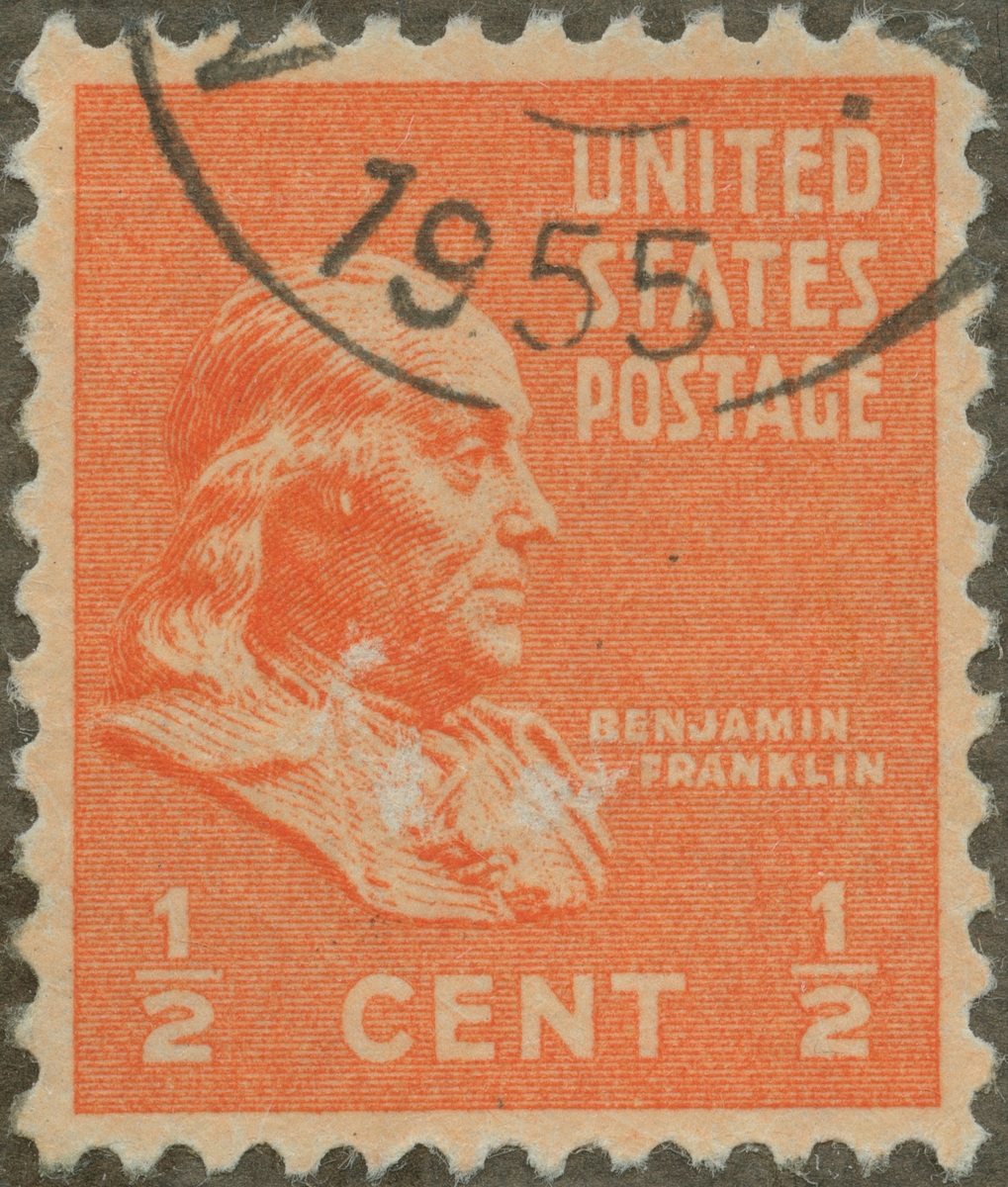 Frimärke från U.S.A., 1938. Motiv av Benjamin Franklin: 1706-1790. Boktryckare. Fysiker: Åskledaren Diplomat.