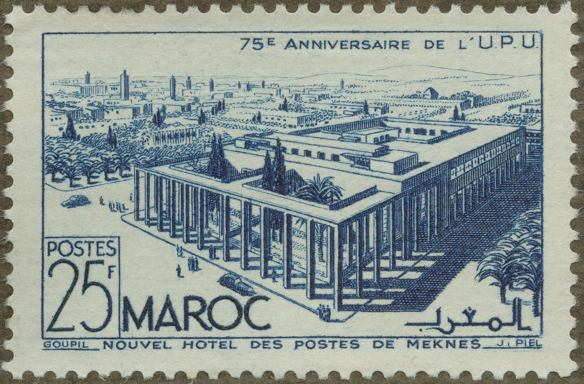 Frimärke från Fr. Marocko, 1949. Motiv av Utsikt över staden Meknès med nya posthus i förgrunden. -Världspostföreningen 75 år.