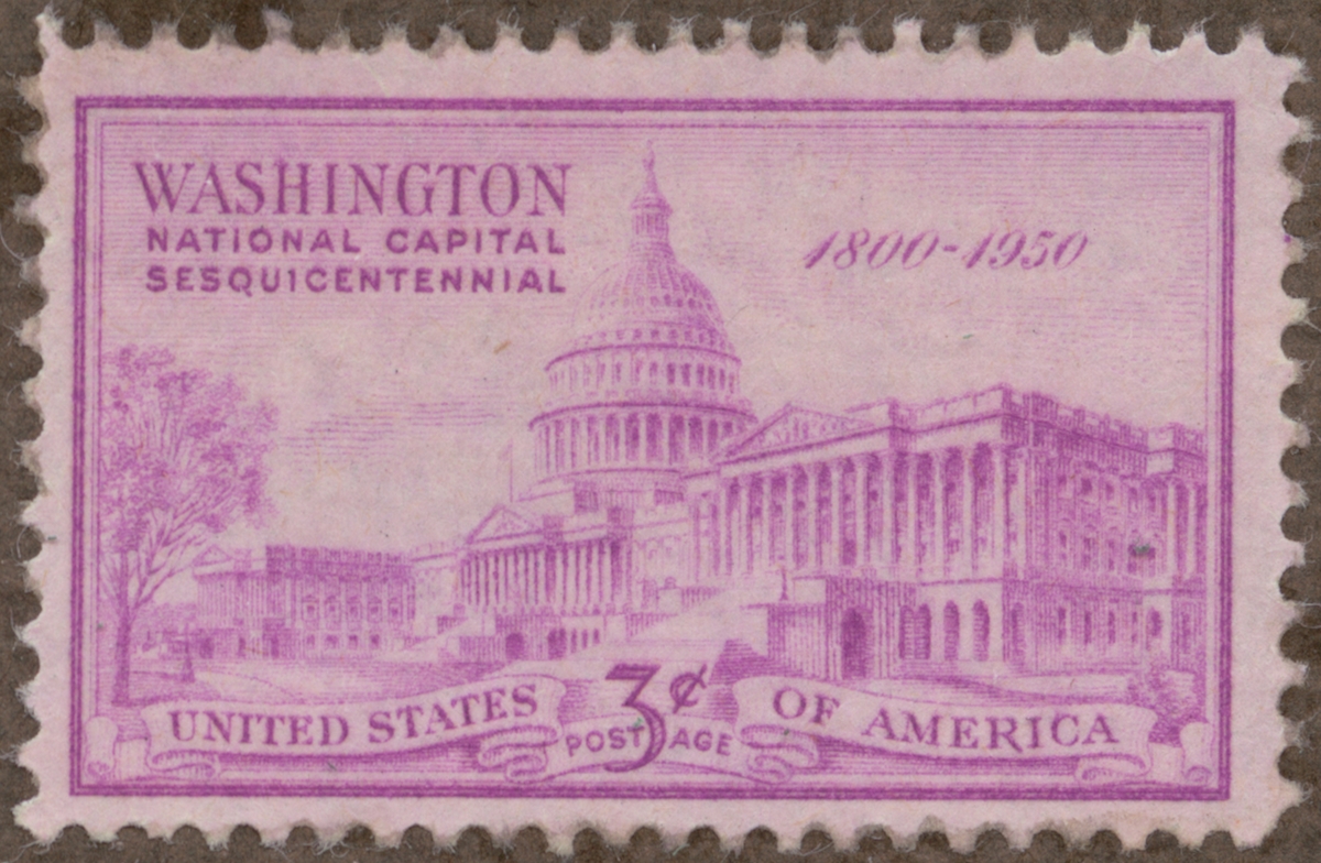 Frimärke från U.S.A., 1950. Motiv av United States Capitolium i Washington, District of Columbia - Staden Washington 150 år: 1800-1950