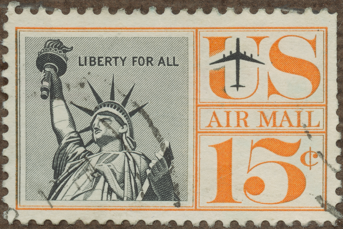 Frimärke från U.S.A., 1959. Motiv av Frihets Statyen i New Yorks Hamn -"Liberty for All"- -Fyr- Gåva från Frankrike till USA: 1886 Flygpostmärke