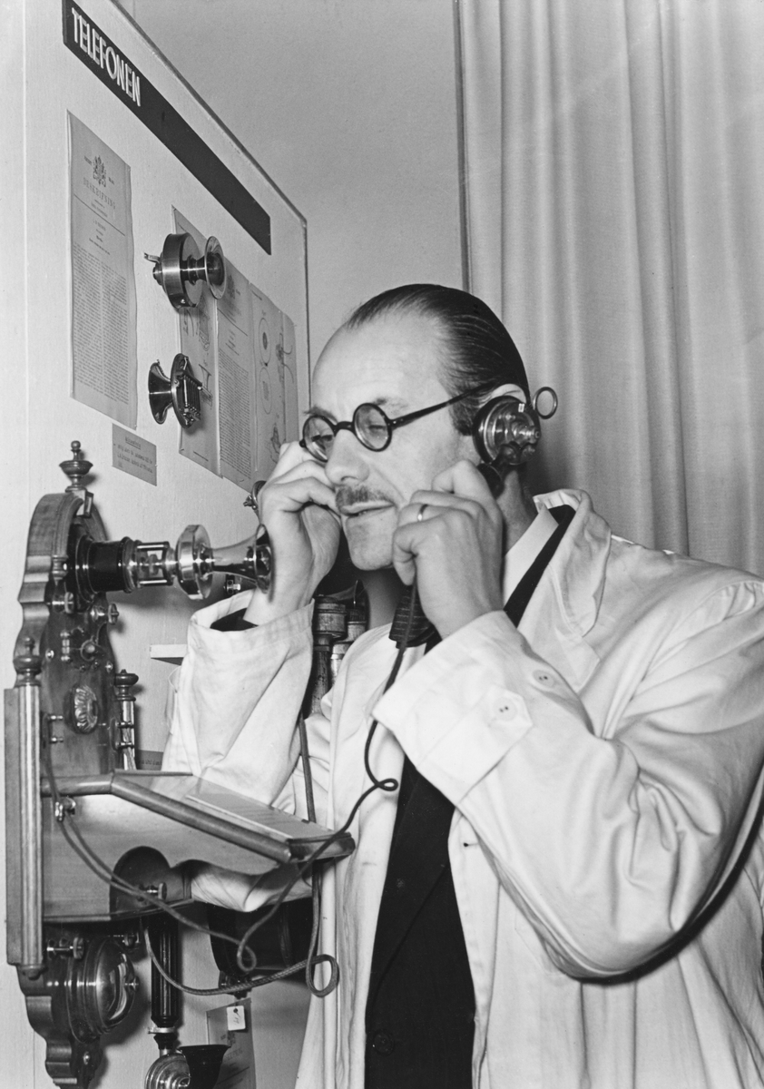 Museidirektör Torsten Althin demonstrerar en av L.M. Ericssons första väggtelefonapparater vid öppnandet av utställningen Idé- Patent- Produkt, på Tekniska museet den 6 december 1941.