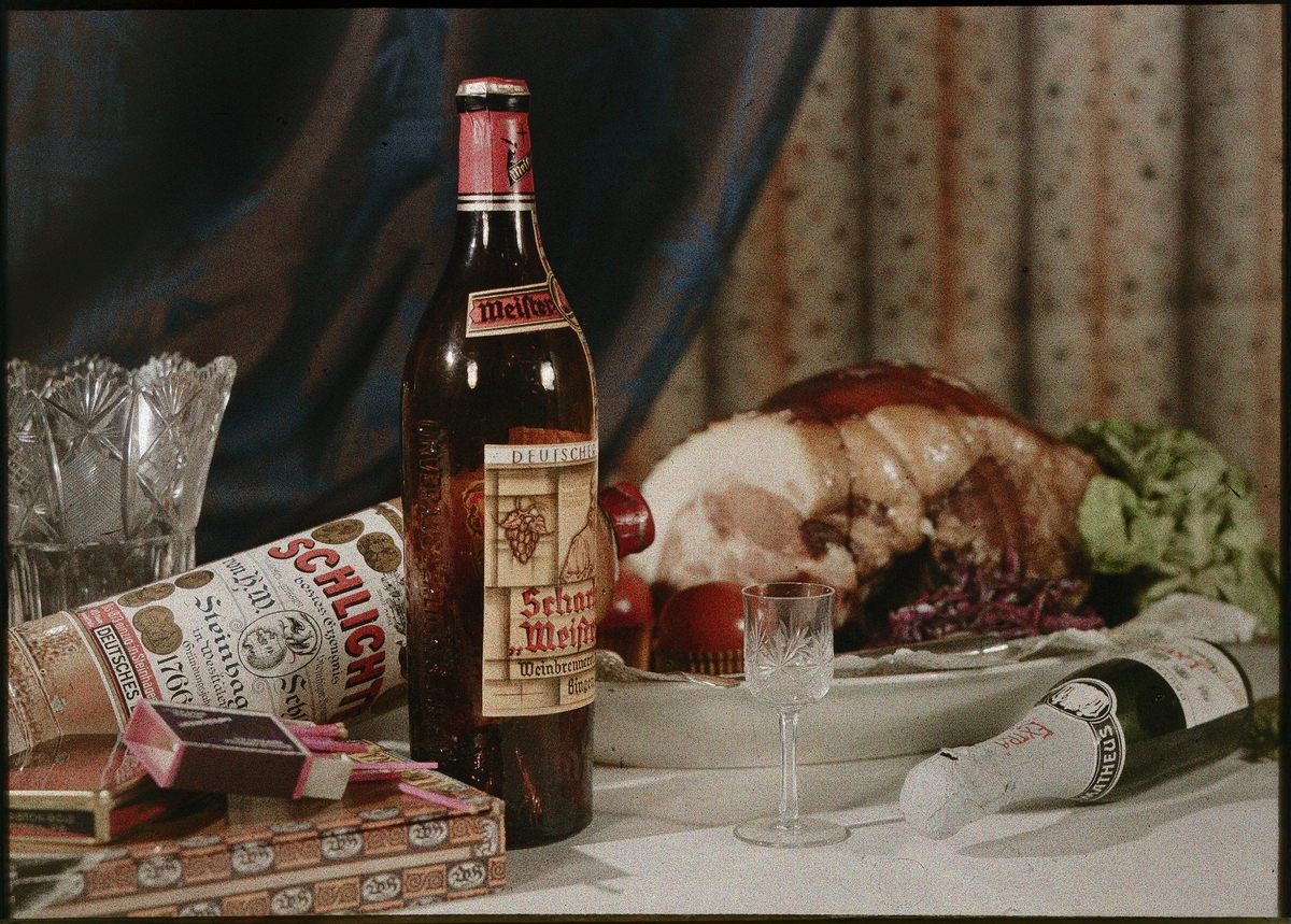 Agfa-autokrom. Stilleben. Glas, flaska, skinka, cigarrlåda och tändstickor. Lichtzeigtunfnutrune? Agfa Lichtzeigtfilter?