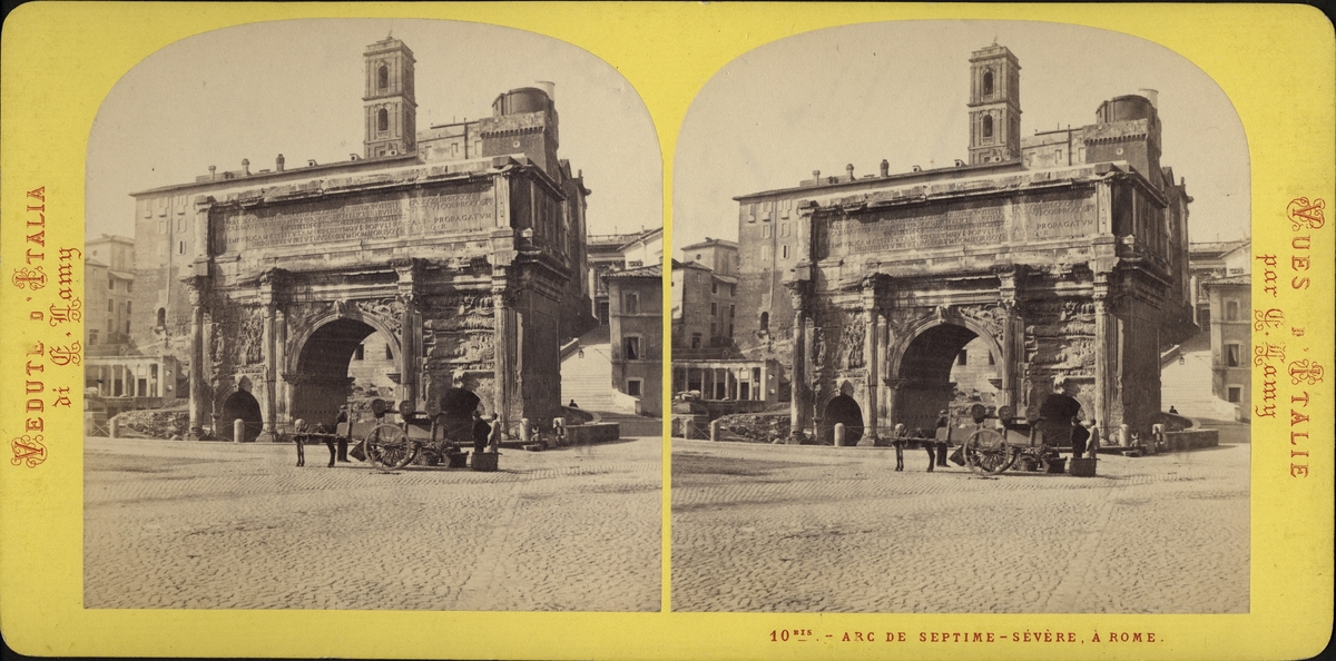Stereobildav man med kärra dragen av åsan, framför Konstantinbågen i Rom.