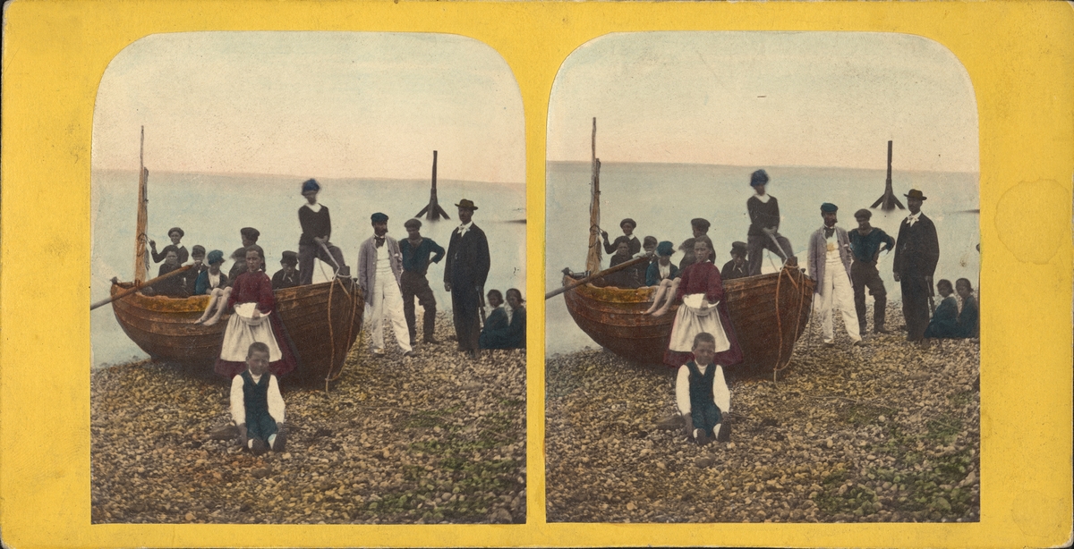 Kolorerad stereobild av folksamling på strand invid eka.