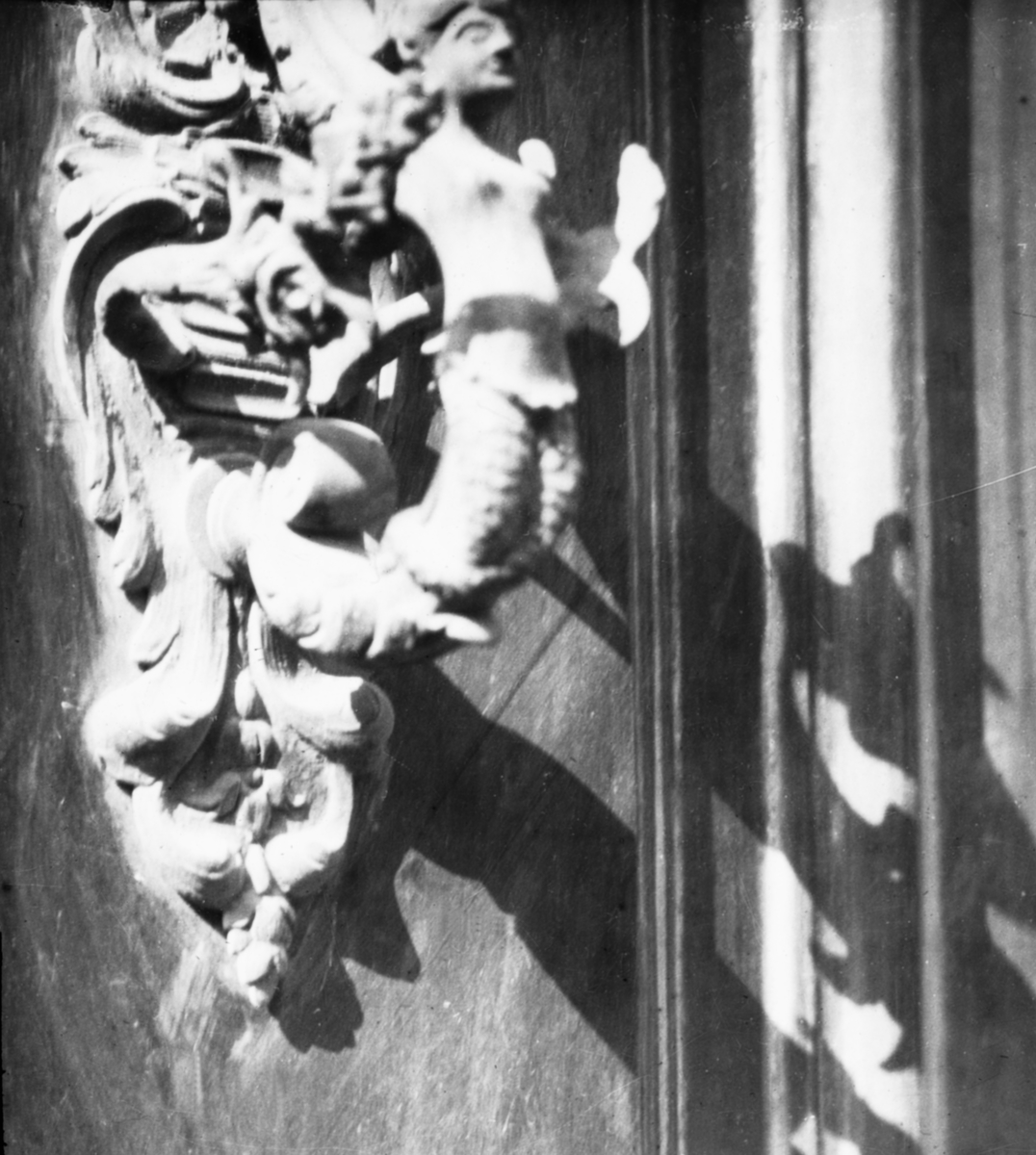 Skioptikonbild med motiv av skulptur på vägg/ dörr någonstanns i Helsingborg.
