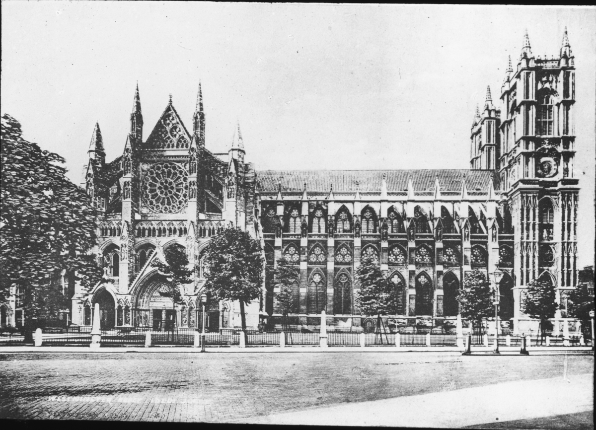 Skioptikonbild med motiv av katedralen Westminster Abbey.