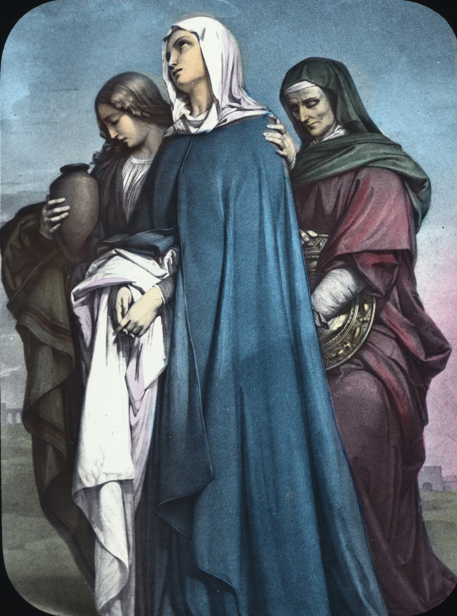 Kolorerad skioptikonbild med religiöst motiv. Sörjande kvinnor.