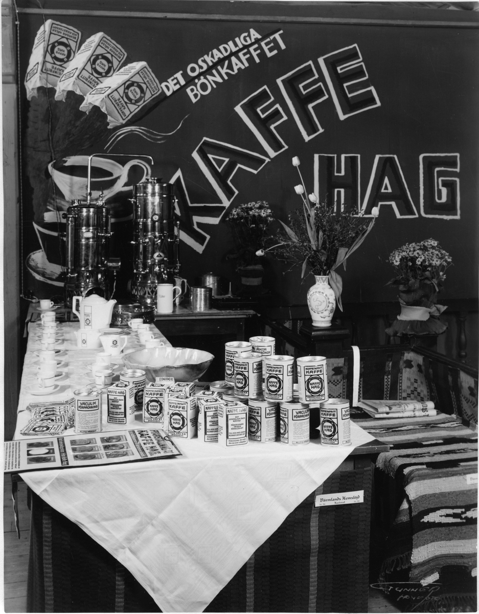 Bygge och Bo-utställningen i Karlstad 1932. Monter för "det oskadliga Kaffe Hag" koffeinfritt kaffe samt Värmlands Hemslöjd.